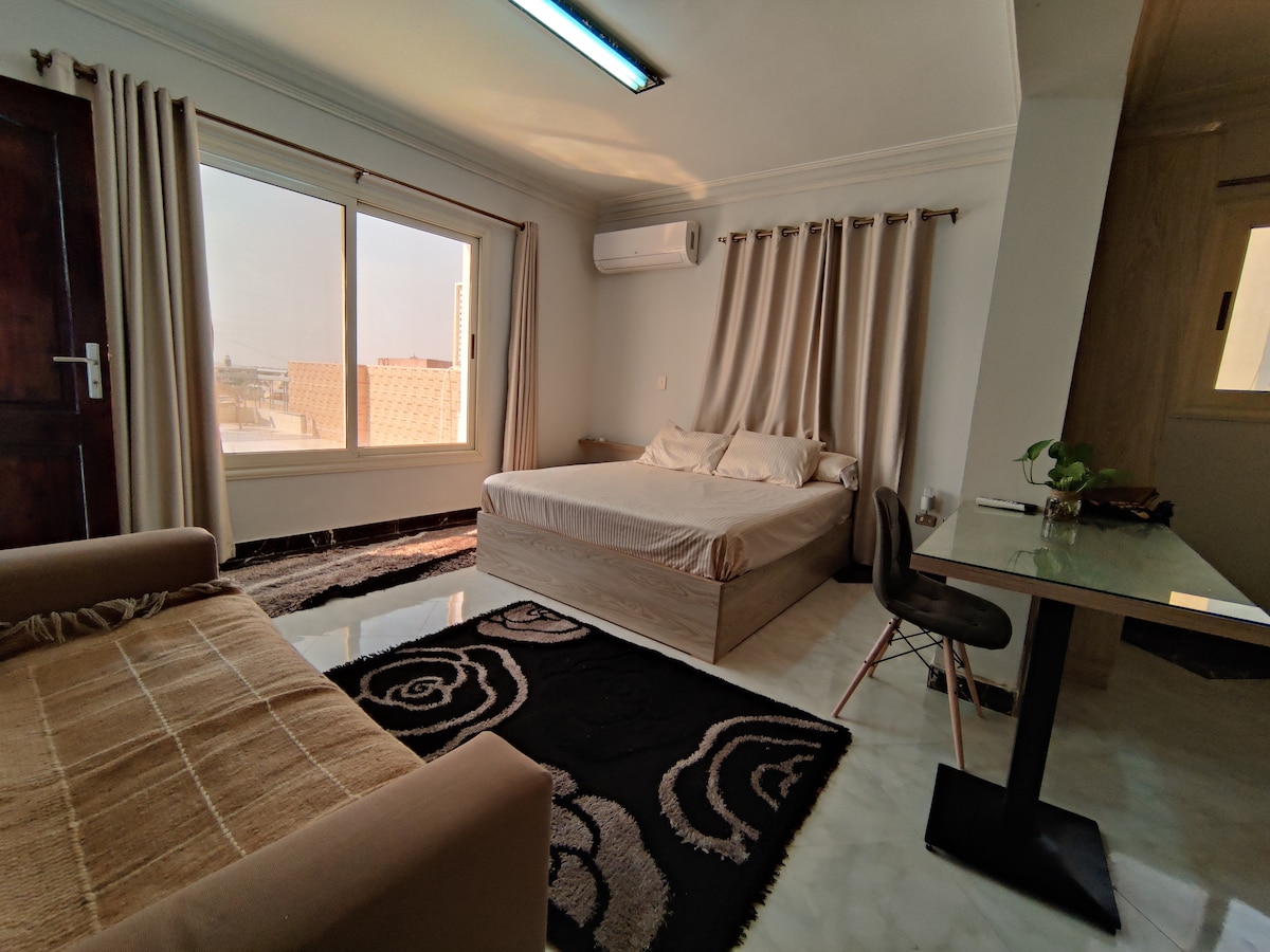 Profitez d'un logement élégant et central. À quelques minutes à pied, vous trouverez la place centrale de la ville El Hosary, dans le quartier le plus demandé, une suite entièrement équipée avec deux lits jumeaux ou un lit Queen Size, une cuisine, un coin salon et un espace extérieur. Les marchés et les restaurants sont à quelques minutes à pied. Les transports en commun sont accessibles à pied depuis notre logement. Les grands centres commerciaux sont à quelques minutes en voiture.