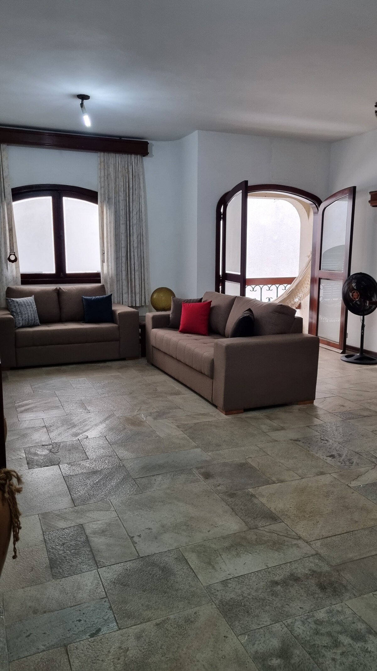 Bel appartement, décoration clean. Il y a 3 chambres, dont 1 suite avec un lit double et les 2 autres qui ont des lits simples identiques qui peuvent être réunis pour former un lit double. La salle peut accueillir 2 personnes supplémentaires. Climatisation individuelle dans toutes les chambres et le salon. Pour ceux qui aiment profiter de la nuit, l'endroit est très proche de la promenade d'Enseada (2 pâtés de maisons de la plage) où il y a des bars, des restaurants, des snack-bars et des magasins. Endroit plus calme et fréquenté par les familles en vacances.
