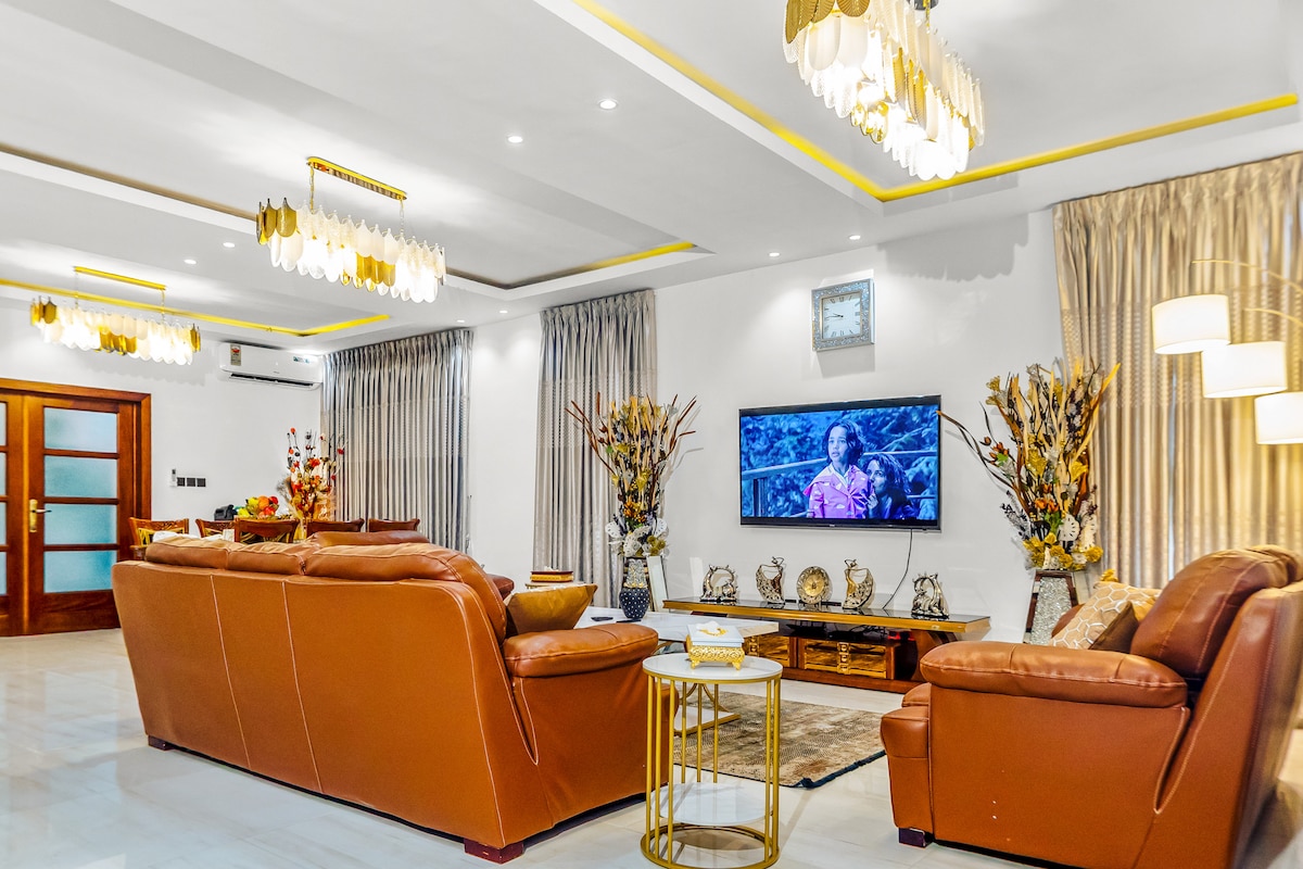 Piscine ☞ privée (extrémité peu profonde de 3,5 pieds, extrémité profonde de 6,5 pieds, piscine 10x23) 🏊 Wifi ☞ Starlink deplus de 250 Mbit/s ✭ Lits King Size confortables (180x200 cm) 🛏️ SUV de luxe✭ privé 7 places avec chauffeur 🚘 Ménage ✭ quotidien disponible 🧹 Générateur ☞ de secours pour une alimentation 24 h/24, 7 j/7 Logement de ☞ 3850 pi2 ☞ 5 téléviseurs intelligents avec Netflix DSTV et chaînes locales (la plus grande mesure 75 pouces) ☞ Parking (sur place, 4 voitures) ☞ Lave-linge + sèche-linge Haut-parleurs Bluetooth son surround ☞ Samsung 11.1.4 ☞ Cuisine entièrement équipée et approvisionnée ☞ Climatisation 》À 25 à 30 minutes de l'aéroport