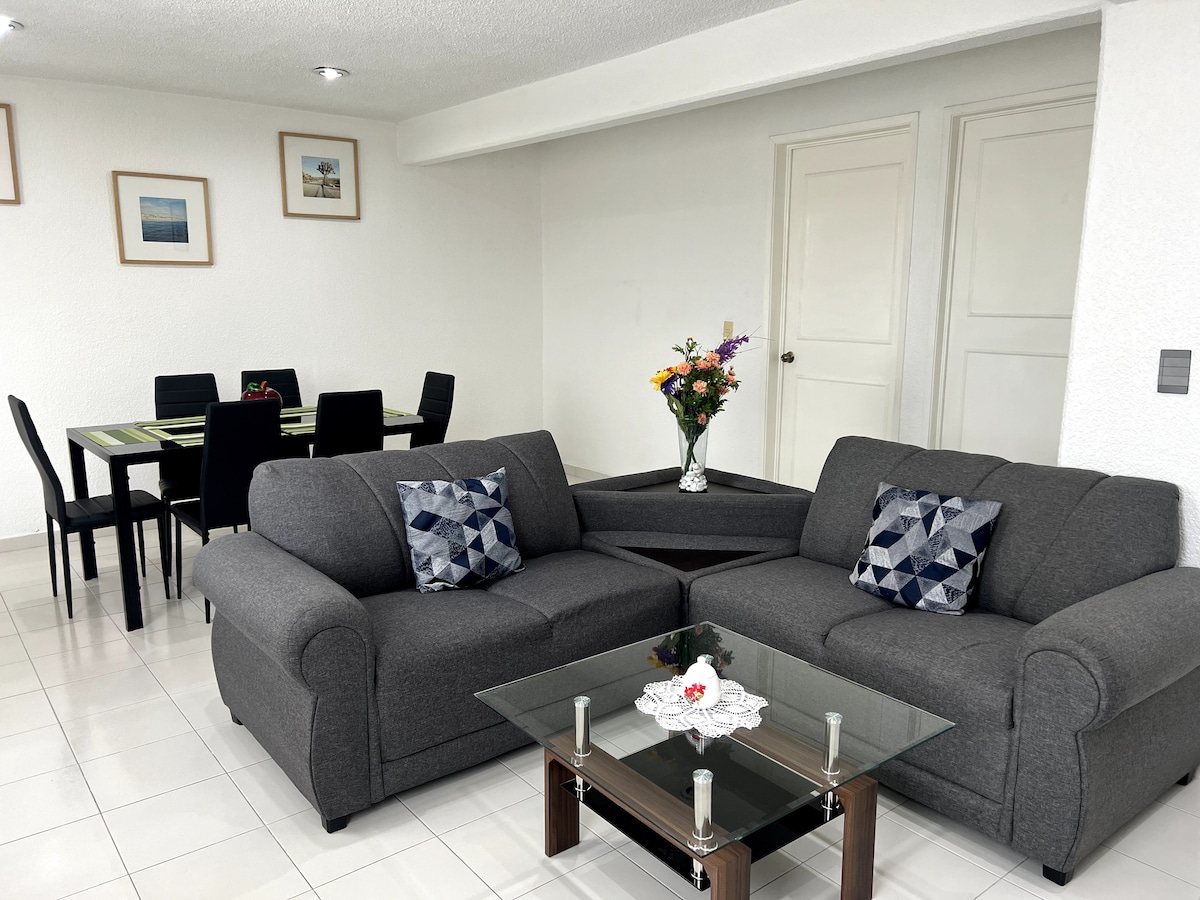 Bienvenue dans notre tout nouvel appartement entièrement équipé ! L'endroit idéal pour un séjour paisible, chaleureux et confortable pour des groupes jusqu'à cinq personnes. Notre emplacement privilégié vous place à quelques minutes de l'aéroport international de Mexico, du Foro Sol, de l'autodrome Hermanos Rodríguez, du Palacio de los Deportes et du stade Diablos Rojos. Avec une surveillance 24h/24 et 7j/7, un parking partagé, un ascenseur et toutes les commodités pour un séjour agréable. Réservez dès aujourd'hui !