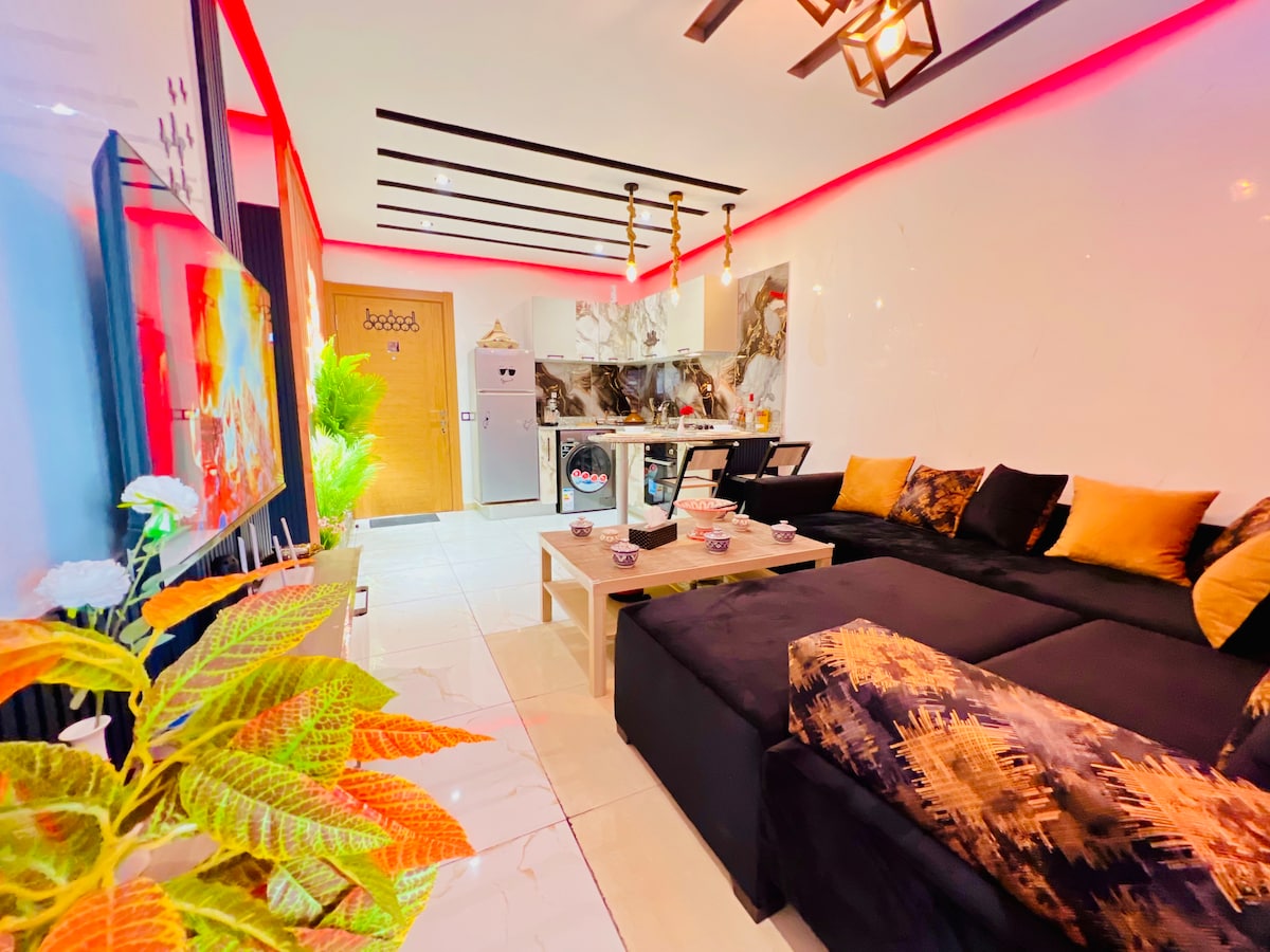 Installez-vous dans un appartement confortable au rez-de-chaussée, idéal pour familles, personnes âgées ou voyageurs avec bagages. À 5 min en voiture de la plage et entouré de restaurants, cafés et fast-foods (Behja Sushi, Baystro, Mister Cook…). Le célèbre Souk El Had est à 10 min, parfait pour découvrir saveurs locales et artisanat. Un logement spacieux et pratique pour des vacances en famille ou entre amis.