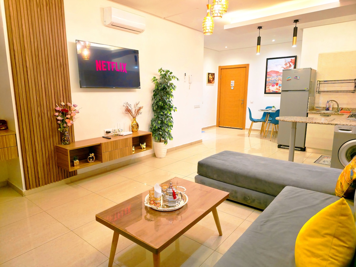 bel appartement climatisé avec terrasse privée au centre d agadir pouvant accueillir jusqu'à 4 personnes . situé au centre d Agadir à 3 min du grand souk El ahed et 5 min en voiture de la corniche idéalement situé pour explorer Agadir et ses environs. Parfait pour: Les couples en escapade romantique Les voyageurs en solo à la recherche d'un pied-à-terre confortable Les personnes en déplacement professionnel N'hésitez pas à me contacter pour plus d'informations ou pour réserver votre séjour.
