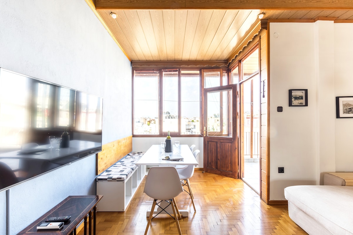 Un luxueux bâtiment historique ancien, avec une vue imprenable sur la colline de Philopappou et la mer, vous accueille à Athènes, pour vous offrir une expérience unique. Vous serez dans un vieux quartier graphique et tranquille. Vous pourrez vous détendre pendant que vous êtes assis sur la terrasse surplombant la colline et la mer et en même temps en 10 minutes à pied, vous pouvez être au Parthénon et aux autres principaux sites archéologiques. L'appartement est nettoyé et stérilisé conformément aux directives du ministère de la Santé.