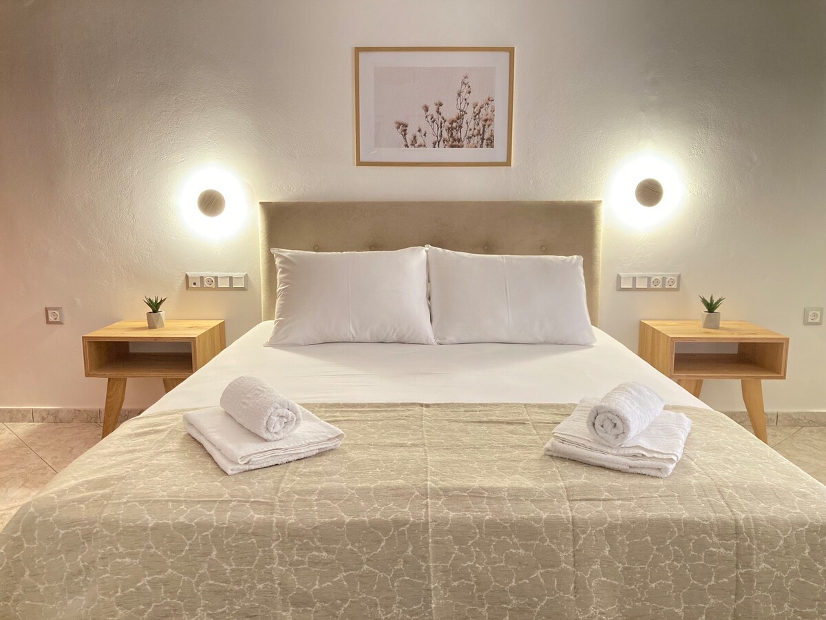 Amathos est un appartement en plein cœur de la ville de Naxos. Il est super central, à l'intérieur de l'ancien château et à seulement deux minutes du port de Naxos. Il peut accueillir jusqu'à deux personnes. Il est situé au premier étage, à l'intérieur des ruelles blanches de la ville de Naxos. Il dispose d'un lit double queen size, d'une salle de bains et d'un balcon extérieur. Nous avons hâte de vous rencontrer et de vous montrer l'hospitalité grecque !