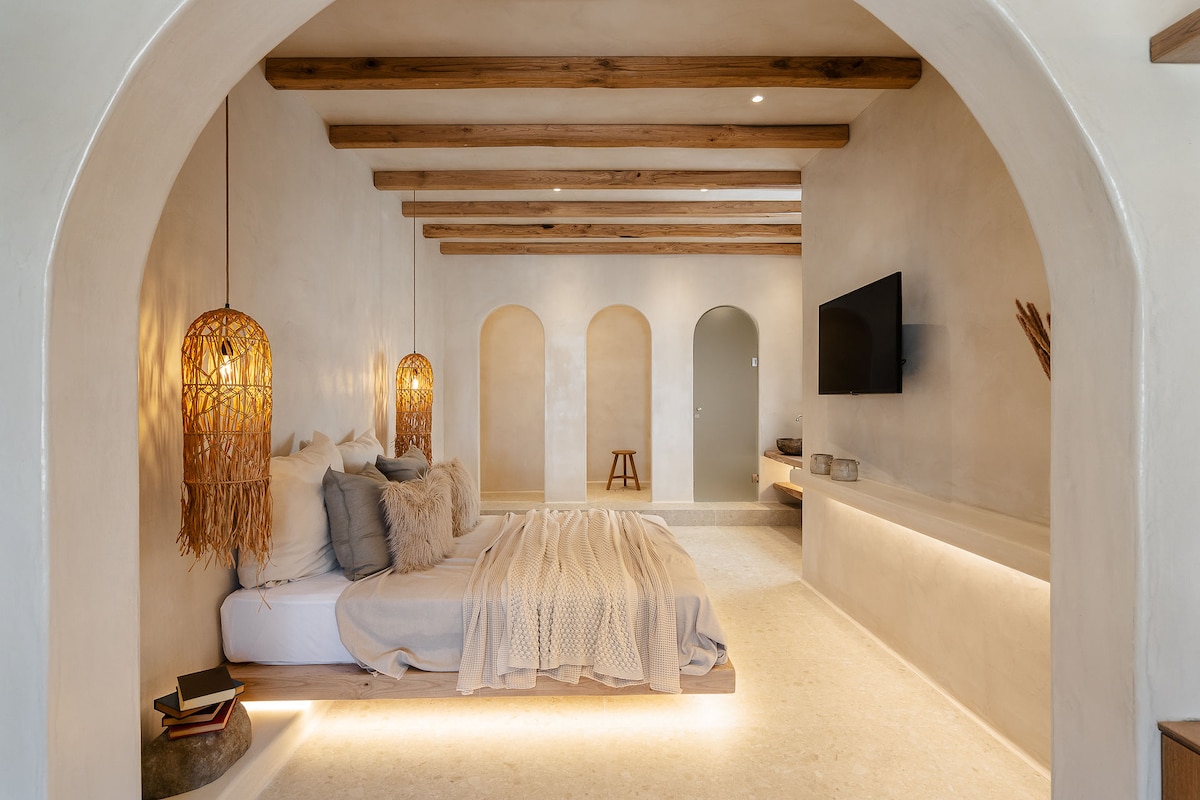 Niché dans la ville de Naxos avec une vue imprenable sur la mer Égée, nous offrons à nos clients la possibilité d'une expérience relaxante exclusive et sans prétention. À proximité du célèbre PORTARA de l'île et du château vénitien. Notre philosophie est d'offrir une hospitalité de premier ordre associée à une intimité inégalée. Bien plus qu'une maison, notre suite de luxe offre un confort suprême combiné à un style élégant et à une hospitalité grecque unique. Ses lignes chaleureuses et minimalistes créent une atmosphère relaxante.