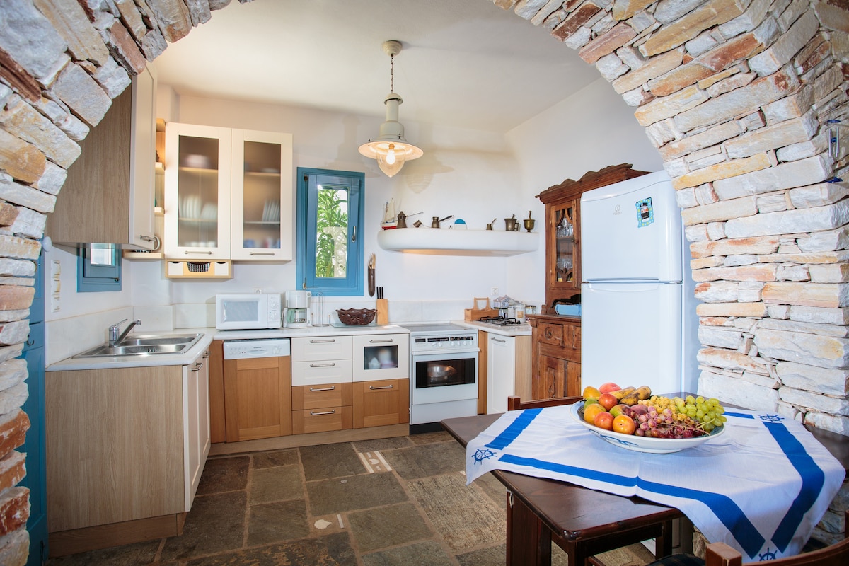 Architecture cycladique avec des maisons peintes en blanc avec des portes et des fenêtres bleues. Le studio est climatisé, ensoleillé et d'environ 25 m2 (215 pieds carrés). Il est équipé de plaques chauffantes électriques, d'un réfrigérateur, d'une cafetière, d'un grille-pain. La salle de bain est avec douche. Un lit pour bébé ou un canapé-lit peuvent être ajoutés.