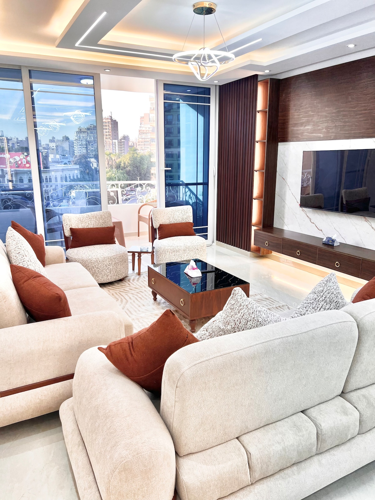 The apartment is located in the most lively place in Giza - Mohandiseen - Sudan Street, Designed for vacationing with family and friends, with a hotel-like ambiance, the apartment is luxuriously furnished to give guests the ultimate relaxing experience during their stay. The apartment offers all the electrical amenities guests require, with 55-inch screens distributed throughout the apartment and bedrooms for watching movie nights. Unlimited WiFi is available throughout the apartment.