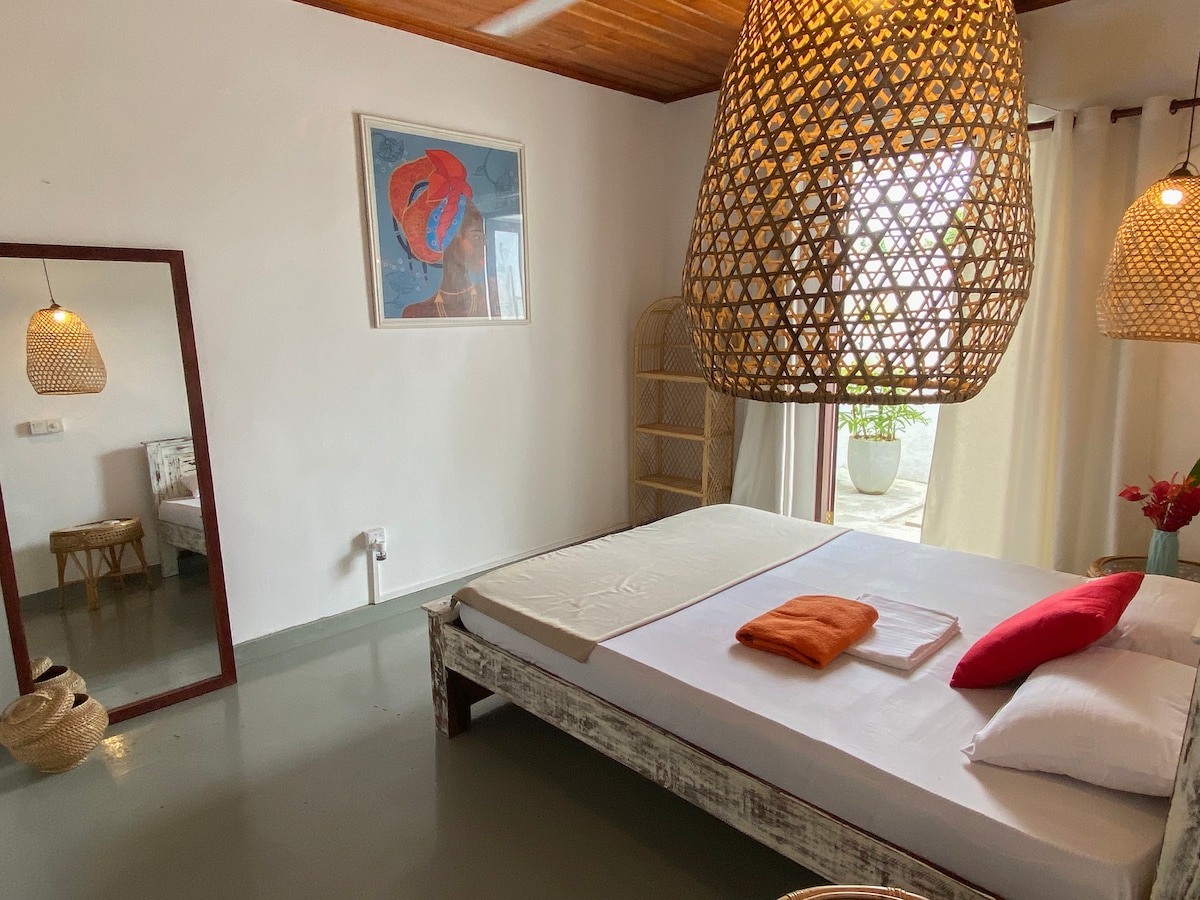 Profitez d'un confort spacieux dans notre suite à l'étage avec deux chambres king luxueuses, un balcon privé et un accès à la cuisine partagée pour cuisiner vos propres repas. Détendez-vous dans le jardin tropical ou dînez à l'extérieur dans la salle à manger extérieure. Parfait pour les familles ou les amis voyageant ensemble, à quelques pas de Zion Beach pour le surf, la baignade ou les couchers de soleil. Cette suite vous offre un mélange parfait d'intimité et d'espace partagé. Nous sommes heureux de vous donner de l'espace pour vous détendre, mais toujours disponibles si vous avez besoin d'aide ou de conseils locaux