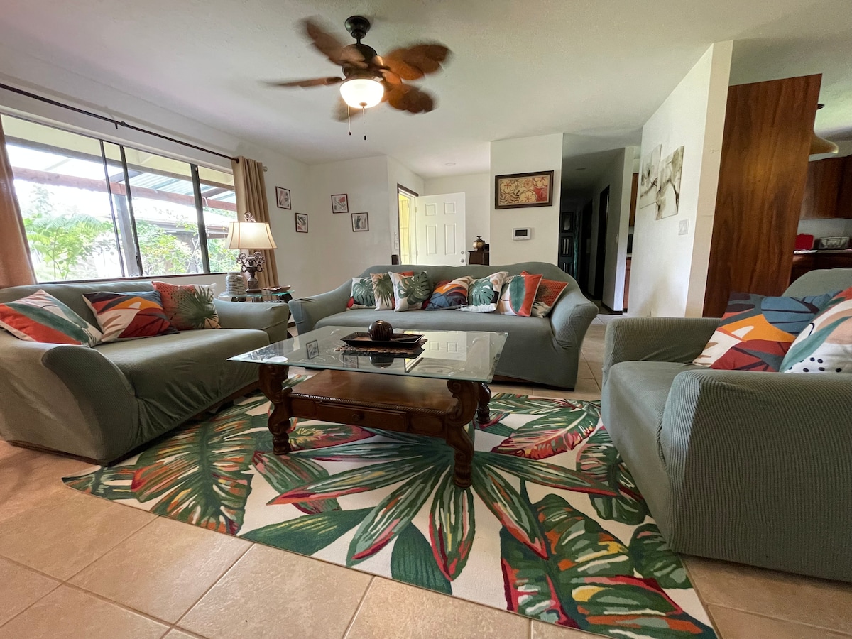Aloha, Jungle Bungalow est une location de maison entière au 2e étage - PAS D'ESCALIER - ACCÈS FACILE PAR RAMPE - dans un paradis tropical ! 2 chambres avec lits King Size, rangement, peignoirs de douche et plus encore ! Vue sur les jardins verdoyants d'anthuriums, de nénuphars et de monstera - chants de grenouilles coqui la nuit, mélodie d'oiseaux avec des matins sereins - café sur la véranda FERMÉE en marchant directement depuis la chambre king bambou et observer la jungle à hauteur de cabane dans les arbres. Parc national des Volcans - 50 min. Shopping/restaurants - 4 mi. Fissure 8 - 2018 - 10 mi.