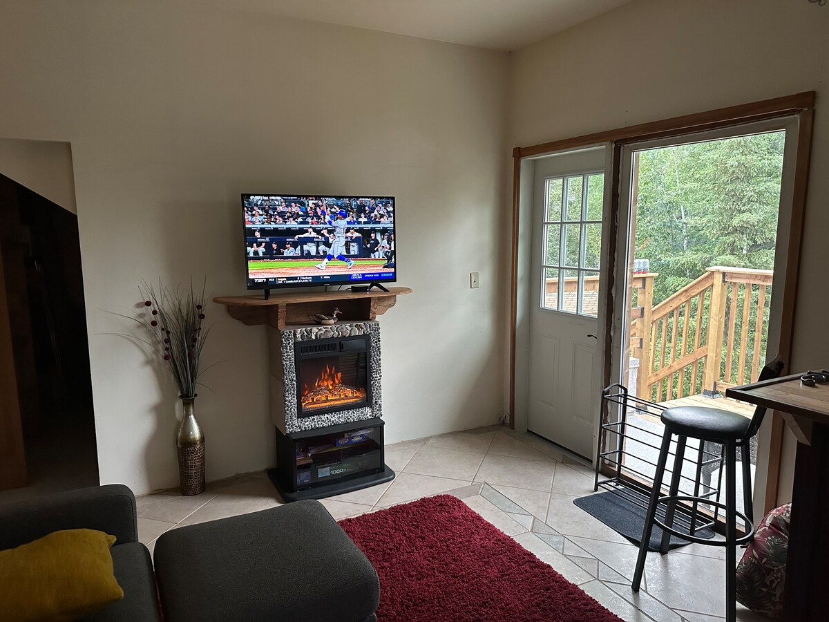 Situé à quelques minutes de La Ronge, vous vous sentirez en sécurité et vous détendrez dans votre maison loin de chez vous. Vous aurez accès à un coin salon avec une télévision et Roku, un lit queen-size et une kitchenette équipée d'un réfrigérateur, d'un four à micro-ondes, d'une bouilloire, d'un grille-pain, d'un Keurig et de la vaisselle/des couverts. Une armoire et une salle de bain complète avec douche sont disponibles. Les amateurs de plein air peuvent profiter des sentiers de ski de fond, de randonnée et de raquette situés juste à côté.