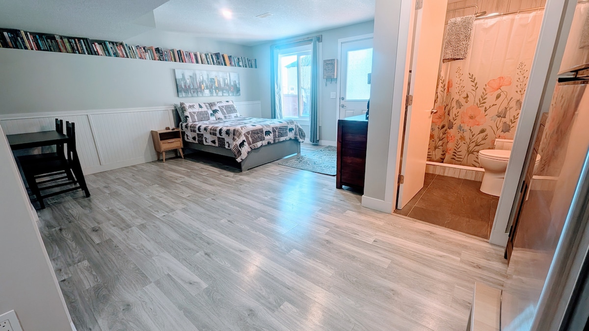 Dans le coin sud-ouest d'Airdrie, emplacement idéal pour accéder rapidement à l'autoroute 2, Stoney, Banff, l'aéroport international de Calgary et Cross Iron Mills. Suite privée lumineuse et confortable à aire ouverte avec un lit queen size confortable et un décor chaleureux. Beaucoup de lumière naturelle avec une atmosphère calme et accueillante. La bibliothèque ajoute une touche chaleureuse pour des séjours relaxants. Le barbecue et la cour complètent parfaitement l'espace. Profitez d'un coucher de soleil et d'une vue sur la montagne. Jolie kitchenette pour préparer les repas et se détendre en fin de journée. Wifi haut débit.
