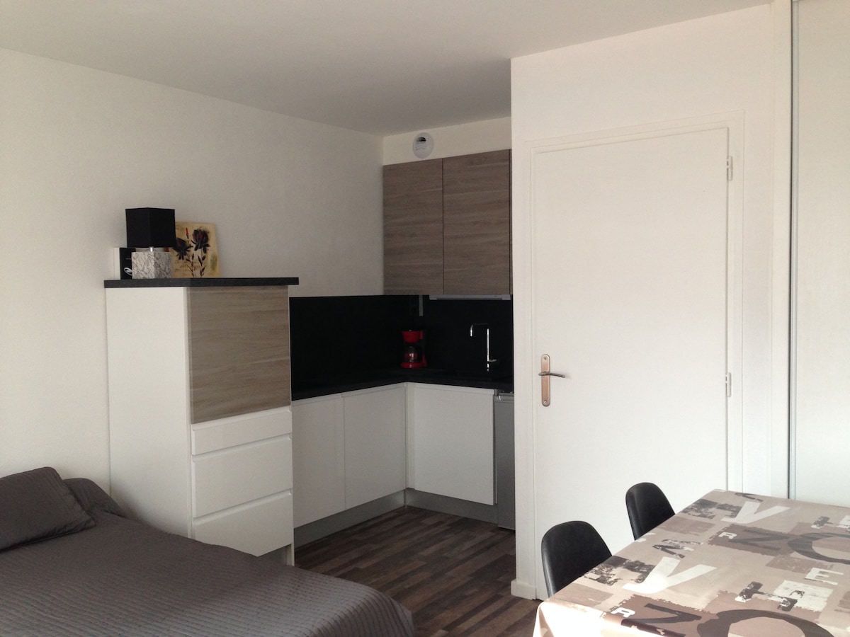 Charmant studio 2 pers proche centre ville refait à neuf. Equipé d'un lit de 140, une salle de bains avec une grande douche 120 /90. Cuisine équipée neuve avec lave vaisselle, réfrigérateur, plaques inductions et Hotte aspirante. Situé au rez de chaussée d'une résidence privée avec cour fermée et place de parking réservée sur place. WIFI haut débit gratuit, TV avec Amazon prime inclus. Situé à 500m du centre ville, commerce ( carrefour market à 300 m), 1 km de la gare. Lac à 1,5 km.