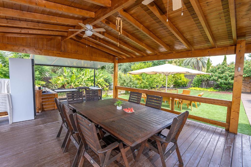 Welcome to "Ram Cabins" located in Sde Trumot. The complex offers 4 delightful rustic family cabins. Each cabin features a private balcony with a seating area, a double bed, a wardrobe, a fully equipped kitchenette, a sofa bed for children, and a dining area. In the shared outdoor area, guests can enjoy a swimming pool, a large dining space suitable for groups, an outdoor kitchen and a barbecue corner. The cabin shown in the photos is suitable for up to 8 guests – 2 adults and 6 children.