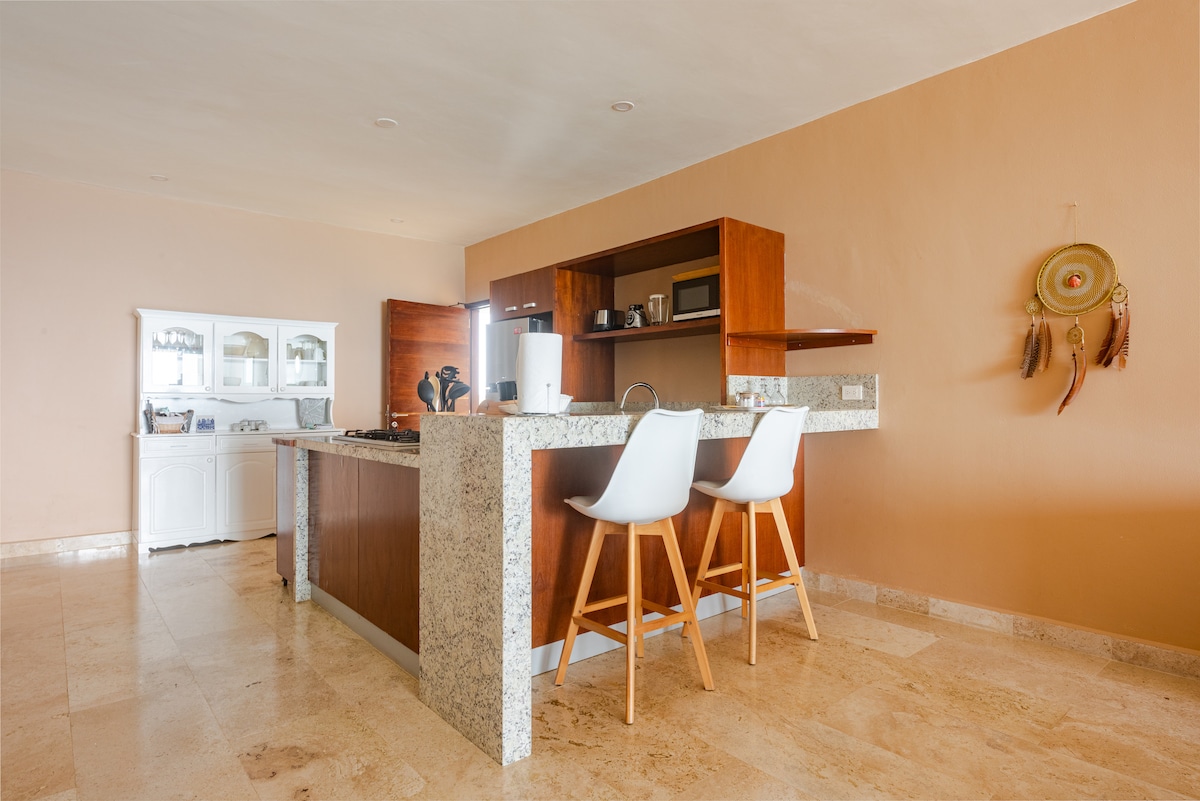 Beautiful 2-bedroom penthouse in Half Moon Bay, between Playa del Carmen and Tulum, in the heart of the Mayan Riviera. Enjoy panoramic views from two balconies overlooking the bay and rainforest. The building has a swimming pool next to the white sand beach, where you can snorkel or kayak among the bay’s coral reefs. The Caribbean Sea stays warm year-round. The emerald-green Yal-Ku Lagoon is minutes away, and at the entrance to Akumal you’ll find the main bay, famous for its giant sea turtles.