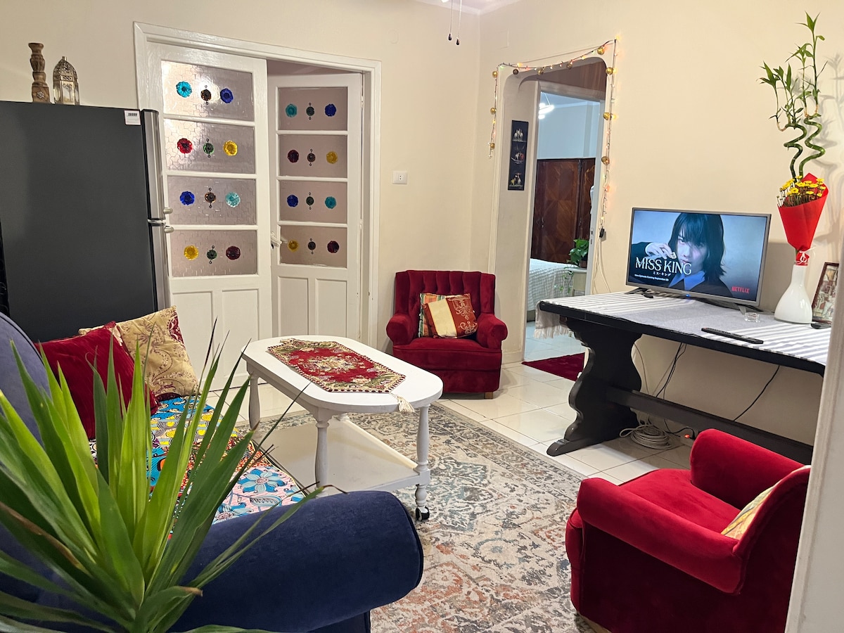 Vous offrant des séjours fiables pour des séjours courte ou longue durée ✨ Ce qui est unique dans cet appartement ? - Transport facile par (Uber/métro/taxi/bus) - À quelques minutes de Zamalek, de la place Tahrir, du musée égyptien, de la tour du Caire, du centre-ville. L'emplacement est central à tous les sites touristiques.🎭🎪🕌🗿 - Wi-Fi très fort. - Télévision connectée (avec Netflix :D) - Réfrigérateur, micro-ondes, bouilloire, plaques de cuisson et ustensiles de cuisine, fer à repasser, sèche-cheveux - Balcon 🌳🍃 🧸Restez simple dans ce cadre paisible et logement situé au centre.🚪