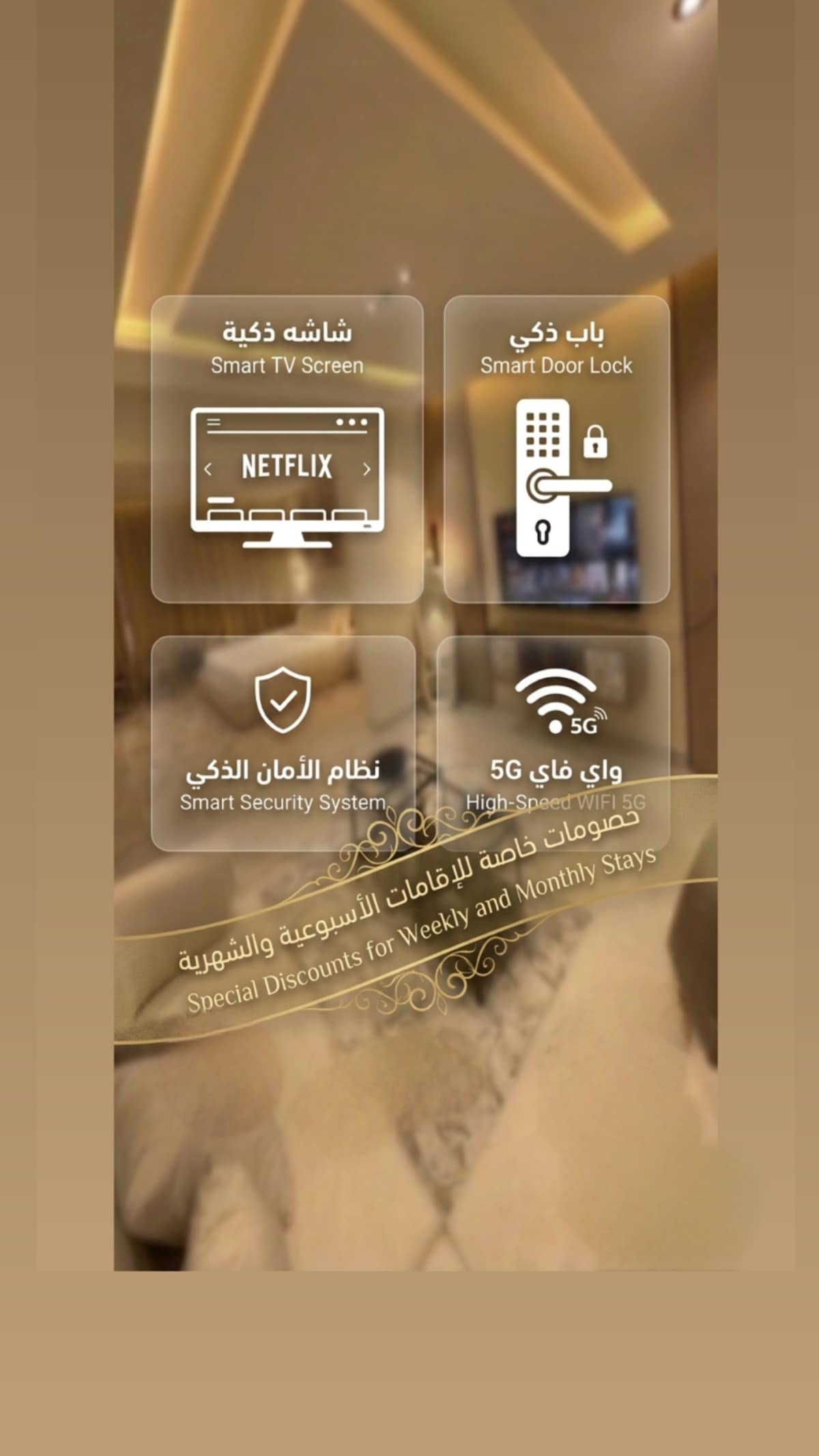 Au centre de Najd et dans les plus beaux quartiers de Riyad, à deux pas de la ville de Mohammed bin Salman à pied, cet appartement a un design Najdi et une identité luxueuse dans tous les coins, un hall spacieux pour cinq personnes avec une table à manger avec deux chaises, une télévision QLED 75 pouces avec système intelligent WebioS, une cuisine entièrement équipée, un lave-linge italien 8 kilos, une chambre avec un jacuzzi au milieu pour passer votre journée à vous détendre de l'agitation de la vie avec un projecteur à l'intérieur de la chambre, un dressing pour un bel espace pour ranger vos vêtements et vos effets personnels, une salle de bain avec toutes les fournitures de santé et de soins personnels.