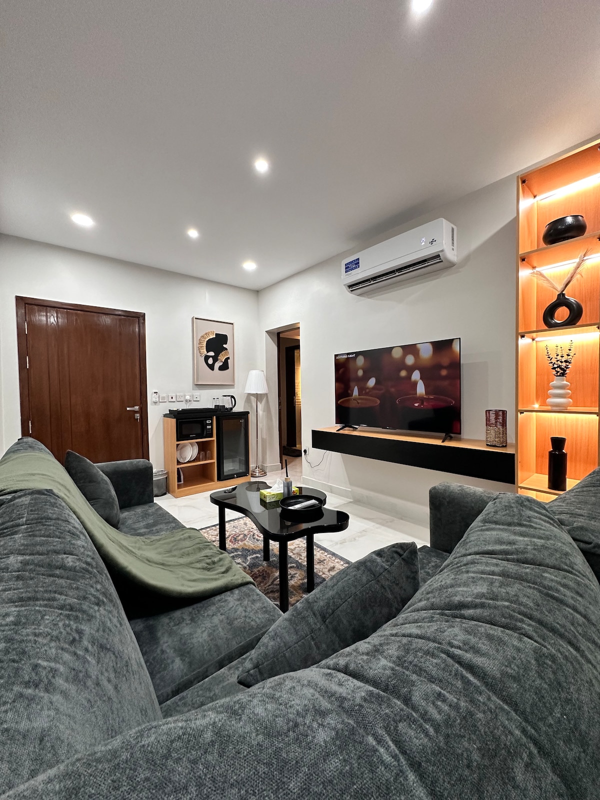 Studio entièrement équipé Emplacement : Belt Zone A proximité de tout les services et événements - Train de Haramain : 7 minutes - Mosquée du Prophète : 8 minutes - Aéroport : 15 min - Mosquée Quba : 10 minutes Se compose de : Chambre + salle de bain Services - Connexion intelligente - Réfrigérateur. - Télévision 60 pouces - Service de ménage quotidien Netflix + Watch + Youtube - Parking au sol L'espace : Ce studio moderne dispose d'éléments de design de haute qualité, les voyageurs peuvent se détendre à son salaire luxueux et profiter d'une télévision de 60 pouces, vous trouverez une salle de bain entièrement équipée.