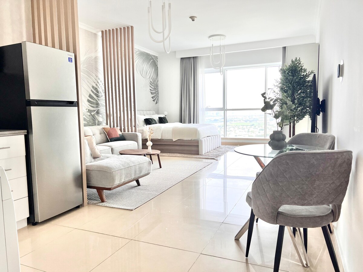 Studio de grand luxe | Étage élevé | Vue sur le terrain de golf Offrez-vous le luxe de notre studio unique entièrement rénové avec vue sur un terrain de golf. Comprend un mobilier haut de gamme, une décoration murale magnifiquement conçue, un coin salon confortable, une kitchenette bien équipée et une salle de bains moderne. Profitez d'équipements tels que la piscine, le gymnase, la piscine à vagues, le terrain de golf, le zoo pour enfants et un centre commercial dans une communauté fermée. Parfait pour un couple ou un voyageur solo. Entrée intelligente sans clé, parking couvert, WIFI et articles de toilette.