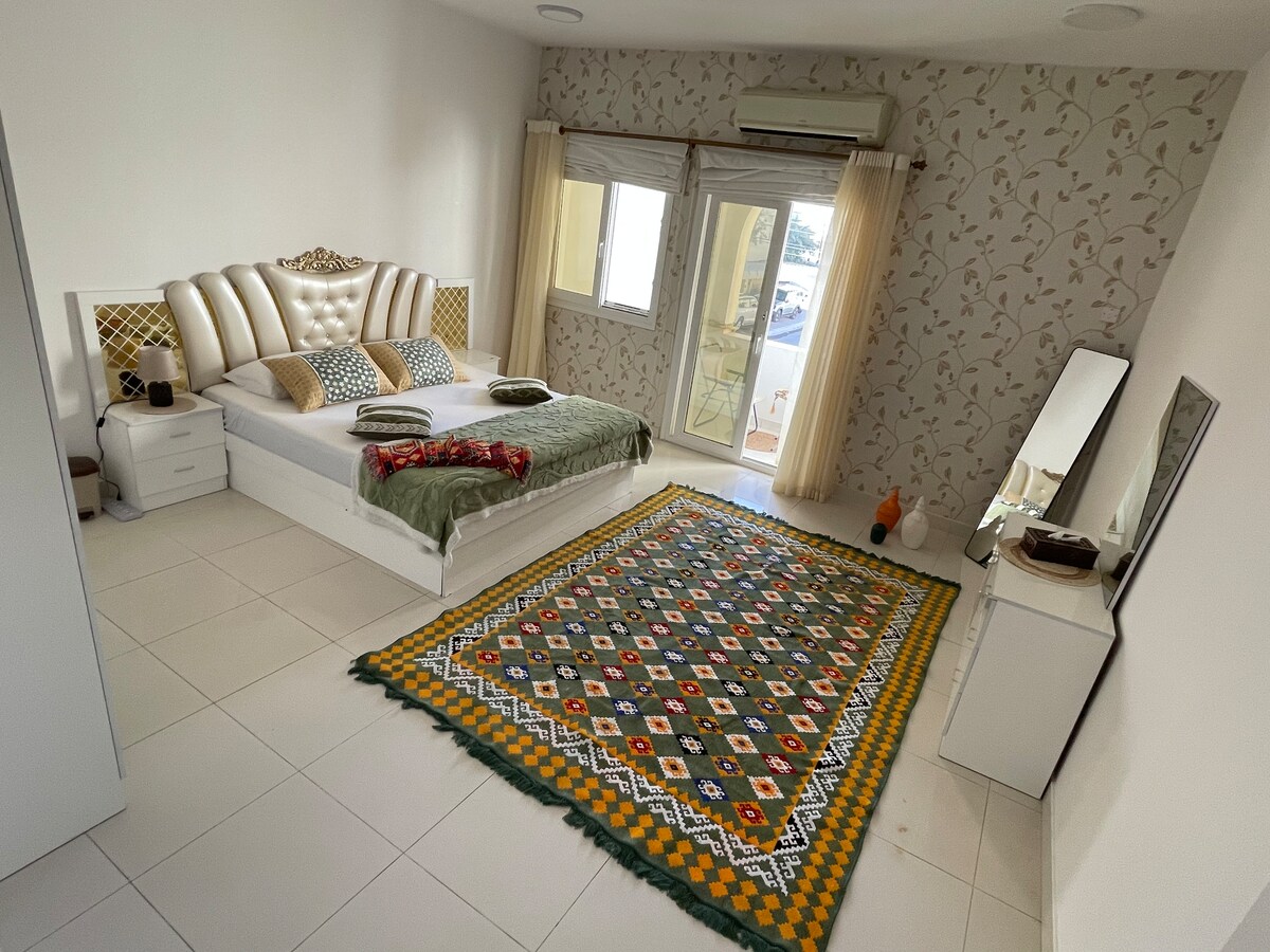 New 1 Bd flat with balcony, living area & 2 toilets.Nice furniture. Equipped with high speed WiFi, bed and dressing,sofa, 50 inch smart TV, satellite and free Netflix access, iron machine, hair dryer,vacuum cleaner, duct AC, ceiling with LED spot lights . You can enjoy the free swimming pool, gym & kids playground and BBQ cooking area. 5min drive from shopping malls, 15-20min from airport. 20min drive from beach, 20min drive from the old Market, next to sand dunes view.