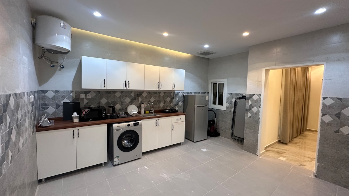 Profitez de toute la famille dans ce logement élégant. Appartement de luxe moderne * Conçu et préparé pour trouver votre confort * Deux chambres ( maître /chambre 3 lits) et un salon spacieux ouvert sur la cuisine moderne Design élégant (écran WiFi intelligent Samsung) Cuisine entièrement équipée - Réfrigérateur. - Four + micro-ondes + lave-linge - Tous les fournitures de cuisine sont complètes. - Cuisinière ( gaz / électrique) En plus de l'emplacement en vedette À 8 minutes en voiture de la gare À 10 minutes en voiture de l'aéroport À 5 min en voiture de la mosquée de Quba À 15 minutes en voiture de la mosquée du prophète