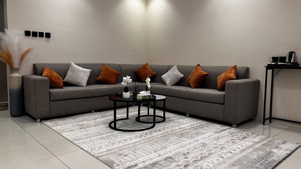 Détendez-vous dans ce logement calme et élégant. Suite de luxe avec vue panoramique complète sur le jardin avec des mûriers, des roses, des roses et des raisins, un service d'entrée intelligent en plus d'un grand écran moderne avec la technologie UHD 4K avec un abonnement au service iptv, toutes les chaînes du monde en plus des chaînes Bein Sports, Saudi Sports, showtime, Netflix et tous les films et séries, (( et la Coupe du Monde😍)) Il y a une mosquée près de la résidence. Et à proximité du parc Al-Radf, des restaurants, des marchés et des cafés de luxe. Il y a un guide touristique pour fournir aux clients tous les endroits qui méritent d'être visités.