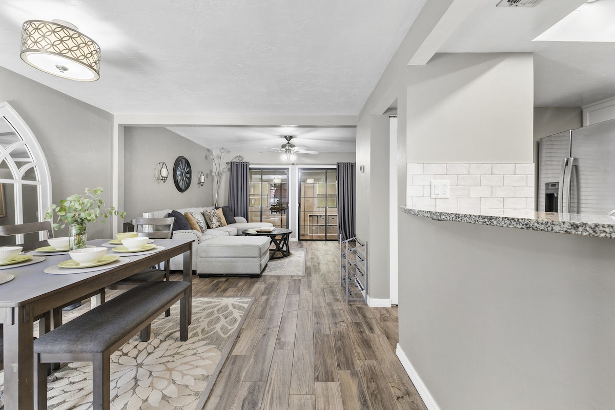 Bienvenue dans une vie luxueuse et pratique ! Cet espace nouvellement redécoré a été créé en gardant votre confort à l'esprit. De beaux meubles, des œuvres d'art et un lit King Size avec des draps de qualité supérieure vous permettront de vous détendre complètement et de vous ressourcer. Avec une cuisine entièrement équipée, vous aurez tout ce dont vous avez besoin pour un séjour facile et reposant. Parking gratuit « invité uniquement » et recharge Tesla 44 miles par heure.