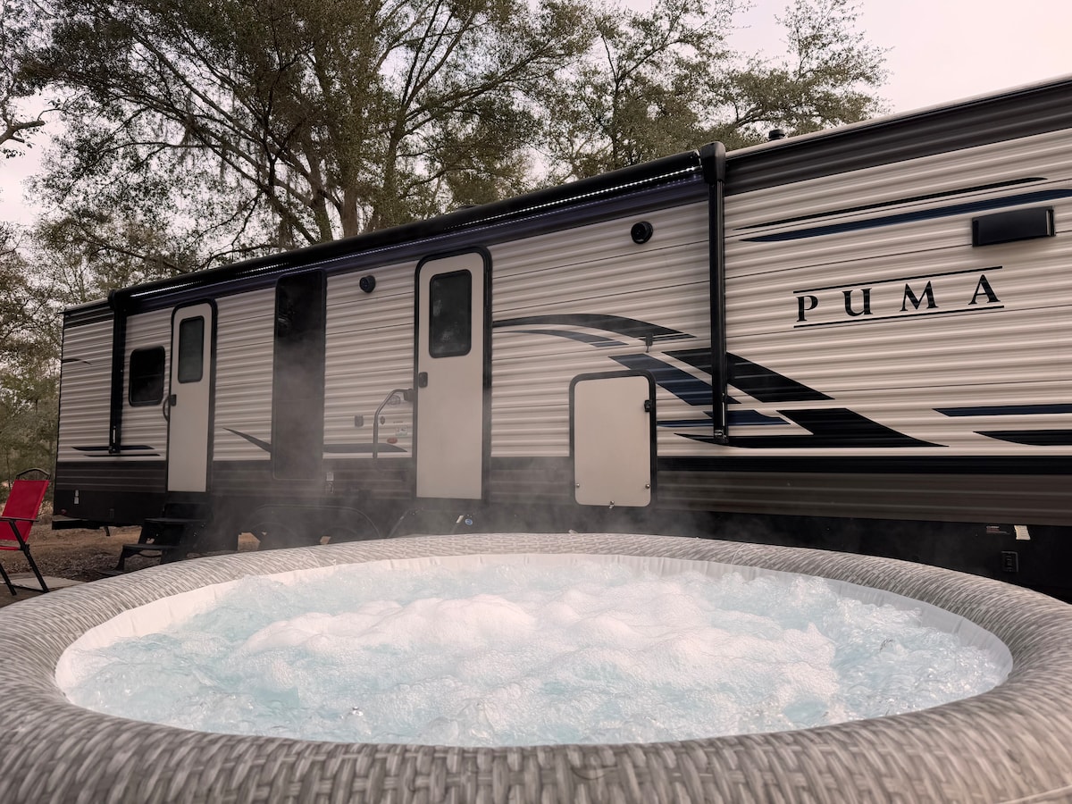 Welcome to The Riverland, where farm meets springs! Come escape to our modern RV right off the Santa Fe River with your loved ones! Our RV gives you the getaway you need to enjoy Mother Nature as you are surrounded by water, matured oak trees, farm animals and wild life. Santa Fe River is known for its beauty and connections to the famous springs in FL (Poe, Ginnie, Blue Springs & more)! *Paddle Board, Kayak rental, horseback riding available.