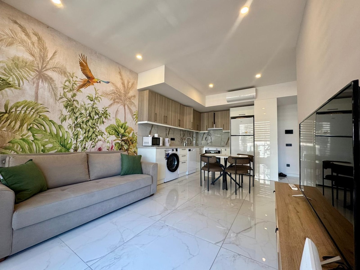 Bel appartement en bord de mer 1 +1. Lexus Residence (70 m2) Avec de nouveaux meubles, accès à la plage et vue sur la mer. Activités complètes en toutes saisons avec un grand balcon pour profiter du café du matin et des repas. Arrivée autonome avec clé intelligente À 7 km du centre et à 35 km de l'aéroport de Gazipasa. Selon la saison, grande piscine intérieure et extérieure, fitness, toboggan aquatique, court de tennis, salle de jeux, salon de cinéma, salle de jeux pour enfants. Salle de fête, espace barbecue et sécurité 24h/24 et 7j/7 (le bain turc et le sauna sont ouverts le week-end).