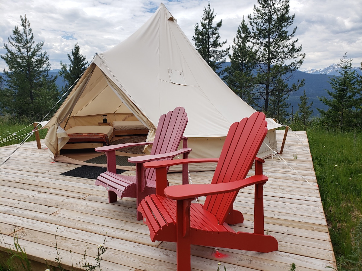 Découvrez l'escapade glamping ultime à Golden, en Colombie-Britannique ! Réveillez-vous avec une vue panoramique à couper le souffle depuis le confort de votre tente de glamping ! Niché en pleine nature, nos tentes murales en toile confortables offrent l'équilibre parfait entre aventure en plein air et confort moderne. Douche chaude, électricité et kitchenette partagée avec barbecue et cuisinière. À 12 min de la ville de Golden. À 21 min de Kicking Horse Mountain Resort, à 10 min du Golden Sky Bridge et à 30 min du parc national Yoho ou du parc national Glacier.