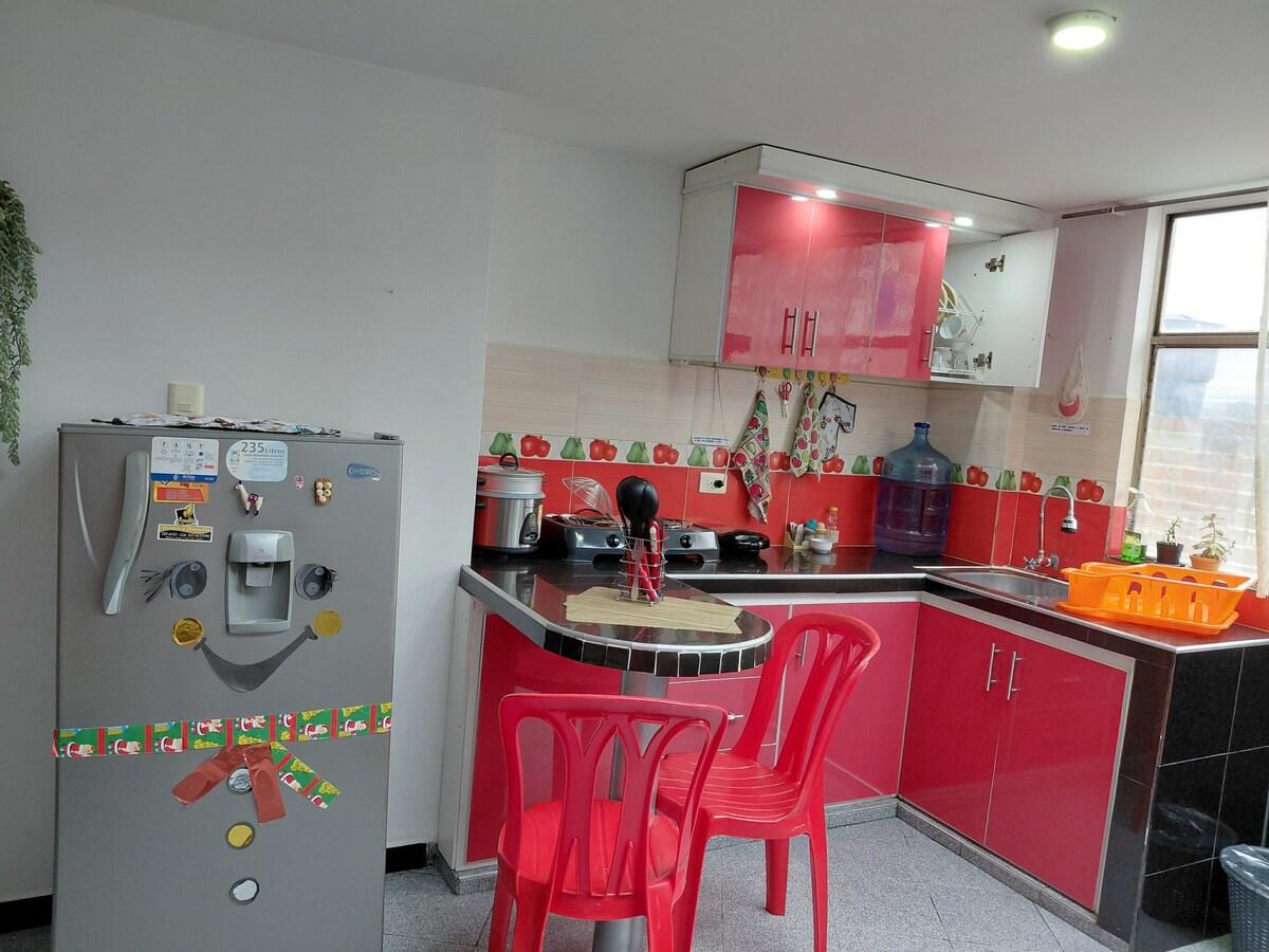 Bel appartement, bien équipé, conçu pour votre confort, avec 2 téléviseurs, 1 barre de son LG, 2 lits et 1 canapé-lit, une coiffeuse, une terrasse avec barbecue, endroit très calme et central, à proximité des zones touristiques et commerciales, pas de soucis pour les longs trajets, accès facile aux transports en commun. Faites de votre séjour la meilleure expérience. Réservez et profitez d'un prix unique par séjour, pour 1 à 4 personnes maximum. À seulement 2 minutes à pied de Mister Pollo Ipiales.