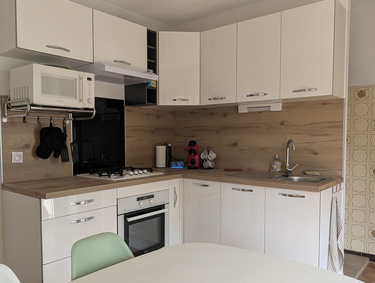 Appartement rénové à neuf en plein centre ville d Alès, situé à 10 mn à pieds de la gare. Espace extérieur terrasse aménagé. Cuisine équipé avec frigo, micro ondes, machine à café, bouilloire et couverts. Par contre, il n y pas de plaques électriques ni gaz pour cuisiner.