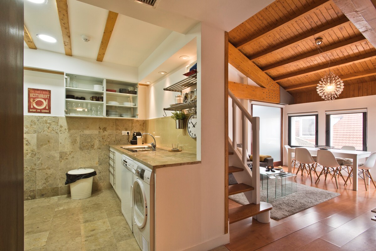 Avec une vue imprenable sur le Tage, cet espace se distingue par ses plafonds en bois brûlé dans des tons dorés, donnant une atmosphère unique et sophistiquée, et par le balcon avec une vue directe sur le fleuve. Ce loft moderne peut accueillir jusqu'à 4 personnes dans ses 94 m². Situé au 4e étage d'un immeuble avec ascenseur, il est au cœur du quartier typique d'Alfama. Vous pouvez vous rendre à pied à tous les principaux points de la ville, faisant de cet emplacement un accès privilégié à la ville de Lisbonne.