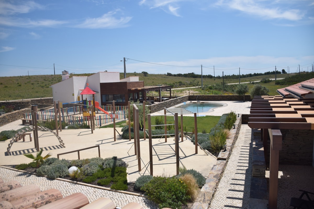 Parfait pour les familles et les amateurs de pleine nature. Endroit calme et reposant au cœur de la côte vicentine. Beau terrain avec des maisons spacieuses, confortables et élégantes. Un havre pour les amoureux de la plage et de la campagne, à 5 minutes du village d'Aljezur et à 15 minutes des plages pour tous les goûts. Construction écologique Taipa, hors réseau, 100 % énergie solaire avec batteries, eau provenant du puits. Vous pouvez louer Casa Poente seule ou Casa Poente et Casa Nascente ensemble.