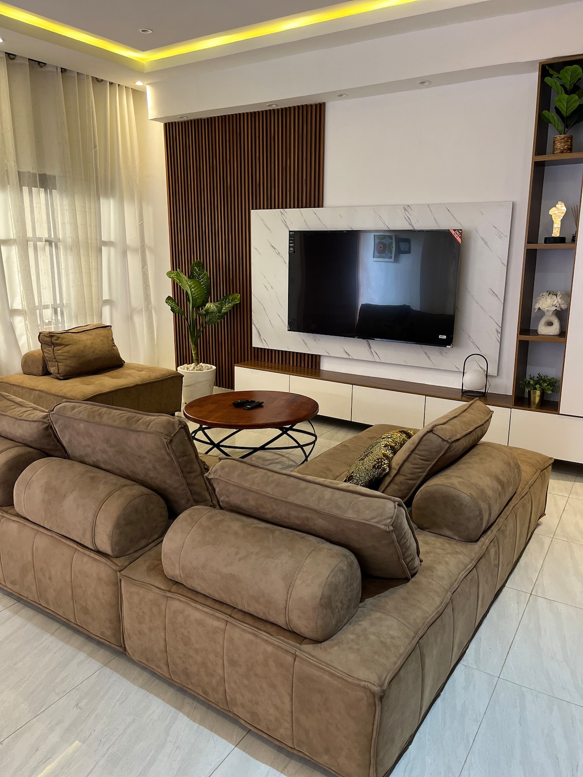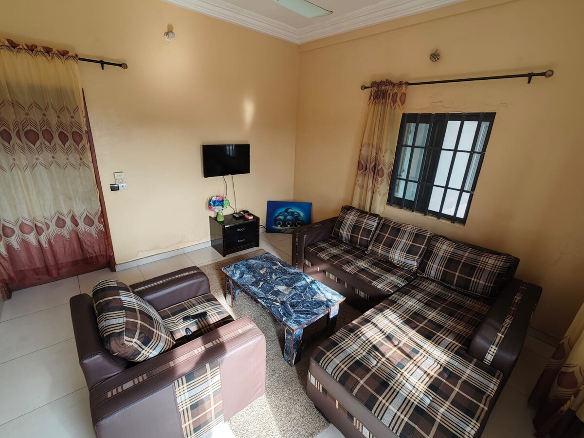 Détendez-vous dans cet appartement calme et élégant de 2 chambres et 2 salles de bain, près du stade Kouhounou à Zogbohoué. Profitez d’un salon lumineux avec 6 places, une Smart TV 65”, climatisation et WiFi. La cuisine comprend un frigo, micro-ondes, cuisinière à gaz et four pour préparer vos repas favoris. Note : L’électricité est à la charge des invités, quel que soit la durée du séjour. Nous avons hâte de vous accueillir !