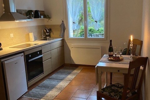 Situé dans un quartier résidentiel en lisière de foret, à 2 Km du centre du village et de ses commerces, vous pourrez vous reposer dans un environnement paisible. Le gite est un studio climatisé situé à l'étage d'une villa indépendante sans vis-à-vis. (les propriétaires sont au rez-de-chaussée) Les extérieurs sont de chaque côté de la maison, assurant le calme et l'intimité de chacun. Vous pourrez profiter d'une cuisine d'été privative avec plancha, frigo, lave-linge, table et transats
