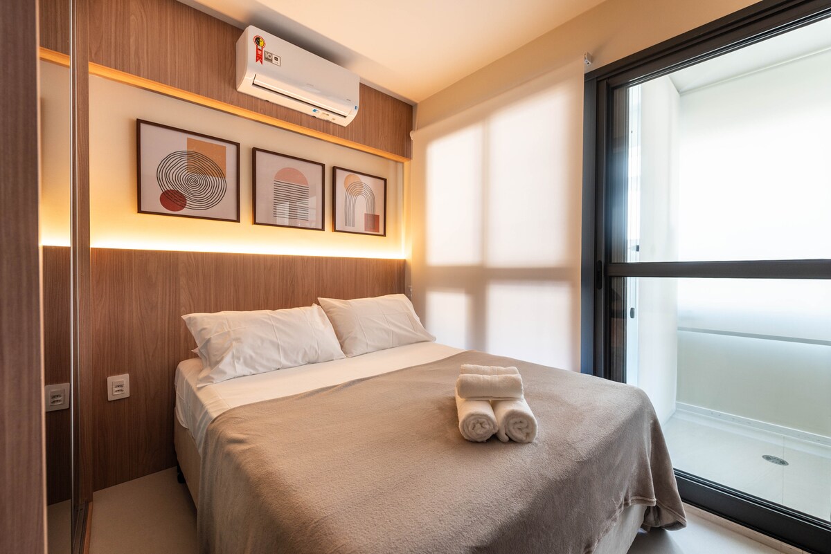Studio-boutique avec l'une des plus belles vues de la ville de São Paulo. Situé à 2 minutes à pied du métro. Cuisine entièrement équipée avec réfrigérateur caché par une porte en bois. Wi-Fi, climatisation et télévision intelligente de 55 pouces. Arrivée autonome avec serrure électronique intelligente. Jouez au tennis ou allez à la salle de sport et détendez-vous dans les piscines (extérieures ou intérieures chauffées) et les saunas (humides ou secs) par la suite. L'espace commun comprend également des espaces de coworking et une buanderie. Les visiteurs doivent être préalablement enregistrés à la réception.