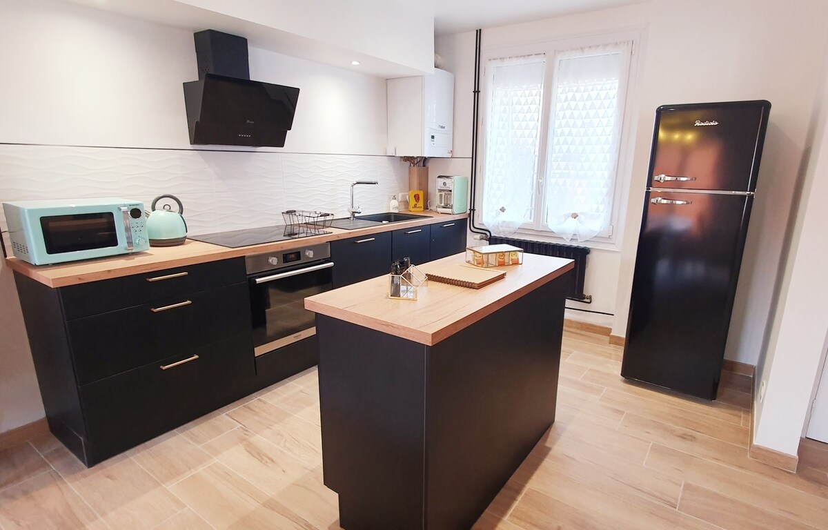 "Au Gobelet de Coëffort" Bienvenue dans notre maison-appartement de 135 m² proche de la gare nord ! Venez passer un moment de convivialité en famille ou entre amis autour du Babyfoot, du bar à Cocktail ou du Jukebox. La grande cuisine lumineuse et le spacieux salon permettent de jolis moments de partage. Notre logement s'adapte parfaitement à vos moments de travail entre collègues : Wifi, RJ45, proche gare (10 mins à pied), 3 chambres avec SDB et WC privatifs, terrasse...