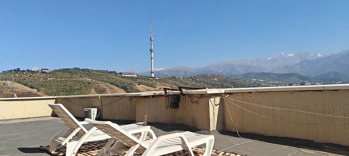 Appartement confortable en plein centre ville avec vue sur la montagne. Un studio propre et confortable au 12e étage dans un quartier calme du centre-ville. Le balcon offre une vue magnifique sur les montagnes : le matin, vous pouvez accueillir la journée avec une tasse de café, et le soir, profiter des lumières de la ville animée. L'intérieur aux couleurs calmes crée une atmosphère de confort et d'harmonie, et la cuisine-studio vous permettra de cuisiner vos plats préférés. L'appartement est parfaitement propre, avec du linge de lit frais et un confort attentionné pour votre séjour.