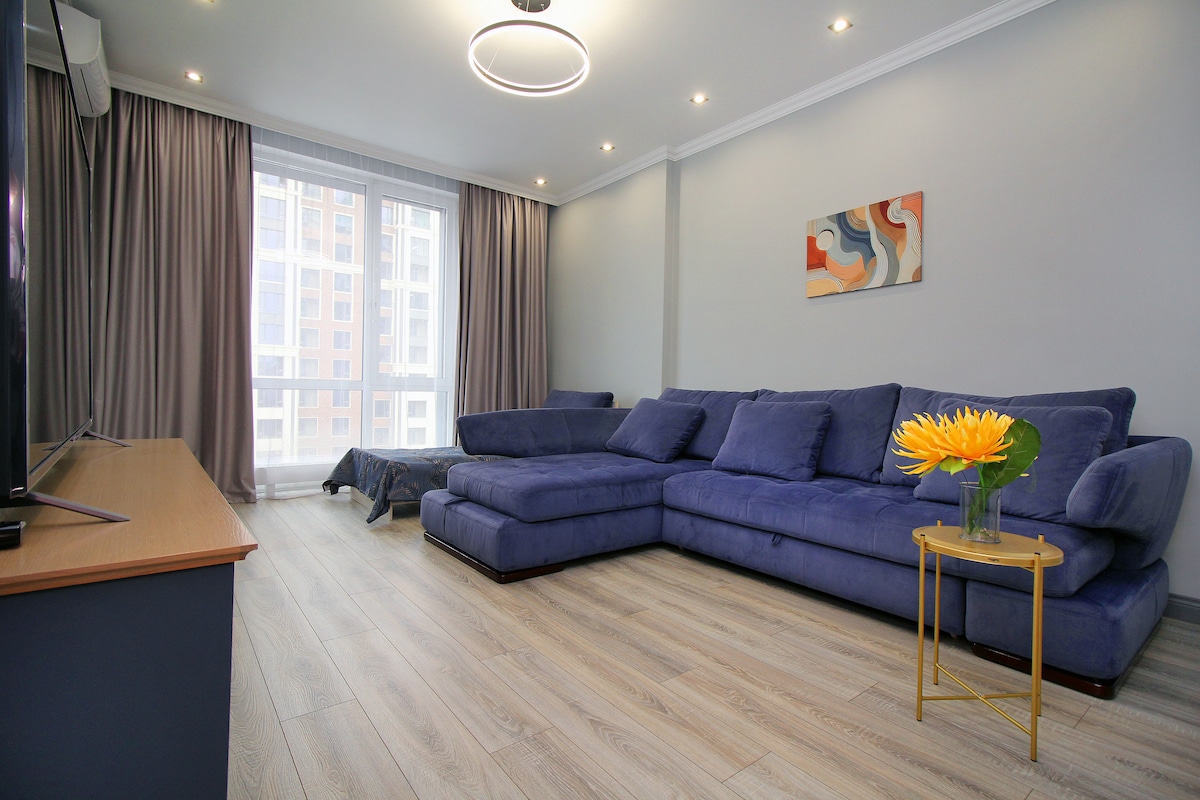 Эта уютная и современная квартира в новом жилом комплексе предлагает идеальные условия для комфортного проживания и аренды. Просторная гостиная с большими окнами наполняет пространство светом, создавая атмосферу уюта и тепла. Стильный интерьер с нейтральными оттенками и качественными отделочными материалами прекрасно сочетается с элегантной мебелью, создавая ощущение гармонии и уюта.