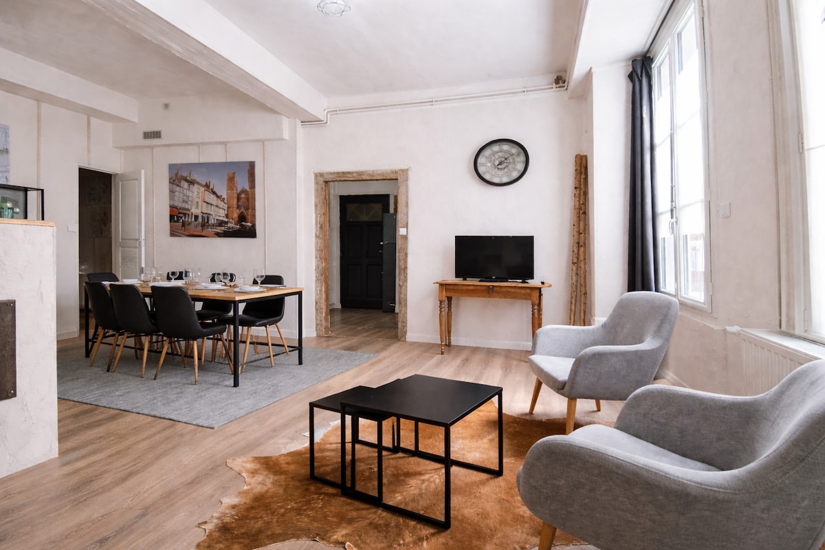 Appartement 80 m² avec caveau bourguignon voûté en pierre Cœur du quartier historique Saint-Vincent à Chalon-sur-Saône Centre-ville accessible à pied Restaurants, commerces et marché à 50 m Logement calme et naturellement tempéré toute l’année Grande table repas pour 8 personnes Idéal séjour touristique, professionnel ou œnologique en Bourgogne Au cœur des vignobles de la Côte Chalonnaise Jusqu’à 8 voyageurs