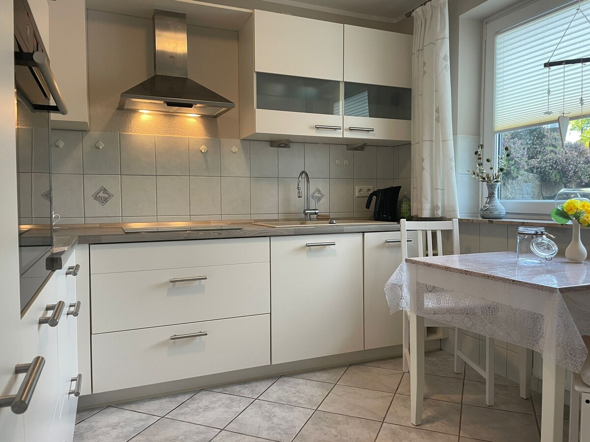Fais comme chez toi dans notre appartement confortable près de la plage et de la forêt et non loin du centre de Flensburg et de la frontière avec le Danemark. L'appartement se trouve dans le sous-sol d'une maison individuelle dans un endroit calme avec vue sur un jardin semblable à un parc L'appartement comprend une cuisine américaine bien équipée, un salon et un coin repas, une chambre avec un lit double et une salle de bain avec une baignoire et des toilettes séparées. Terrasse extérieure et en bois couverte Wi-Fi rapide et télévision connectée 4K