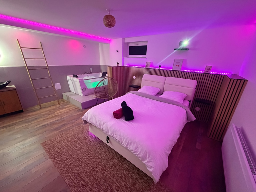 Découvrez notre élégant loft de luxe, un véritable cocon de raffinement et de passion, conçu pour une escapade inoubliable. Envie de raviver la flamme ou de surprendre votre moitié ? Offrez-vous une nuit romantique dans un cadre d’exception, agrémenté d’équipements et d’accessoires haut de gamme Pour sublimer votre expérience, des options supplémentaire sont également disponibles. Si c’est pour se faire plaisir, autant le faire sans compromis !