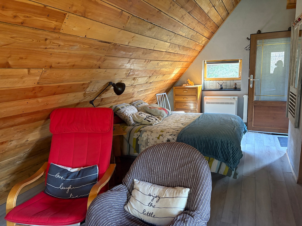 Intimité assurée avec cette sympathique chambre indépendante, bien isolée du reste de la maison, avec entrée commune qui dessert la chambre, la salle de bain, et les wc qui sont cela dit privatifs. Même si quelques jours sont indisponibles, on peut tout de même trouver des solutions intéressantes pour vous. Lit 2 places Bouilloire Micro onde Réfrigérateur TV Wifi Si le séjour dure plusieurs jours possibilité de laver du linge. Eventuellement un accés garage pour les motos ou vélos