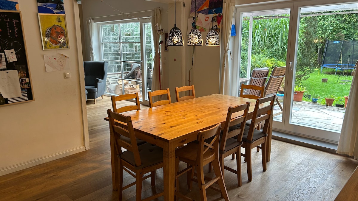 Tu habites ma petite maison mitoyenne classée et fraîchement rénovée dans un cadre idyllique. Vous disposez d'une chambre avec lit double, une salle de bains et la cuisine-salon à usage exclusif. La station de train de banlieue est à 3 minutes à pied, l'aéroport à 2 stations, le centre-ville à 20 minutes du centre-ville. Des places de parking gratuites sont disponibles dans la rue privée. Les commerces se trouvent à 3 minutes de marche. Parcours de course à pied et à vélo juste devant la porte.
