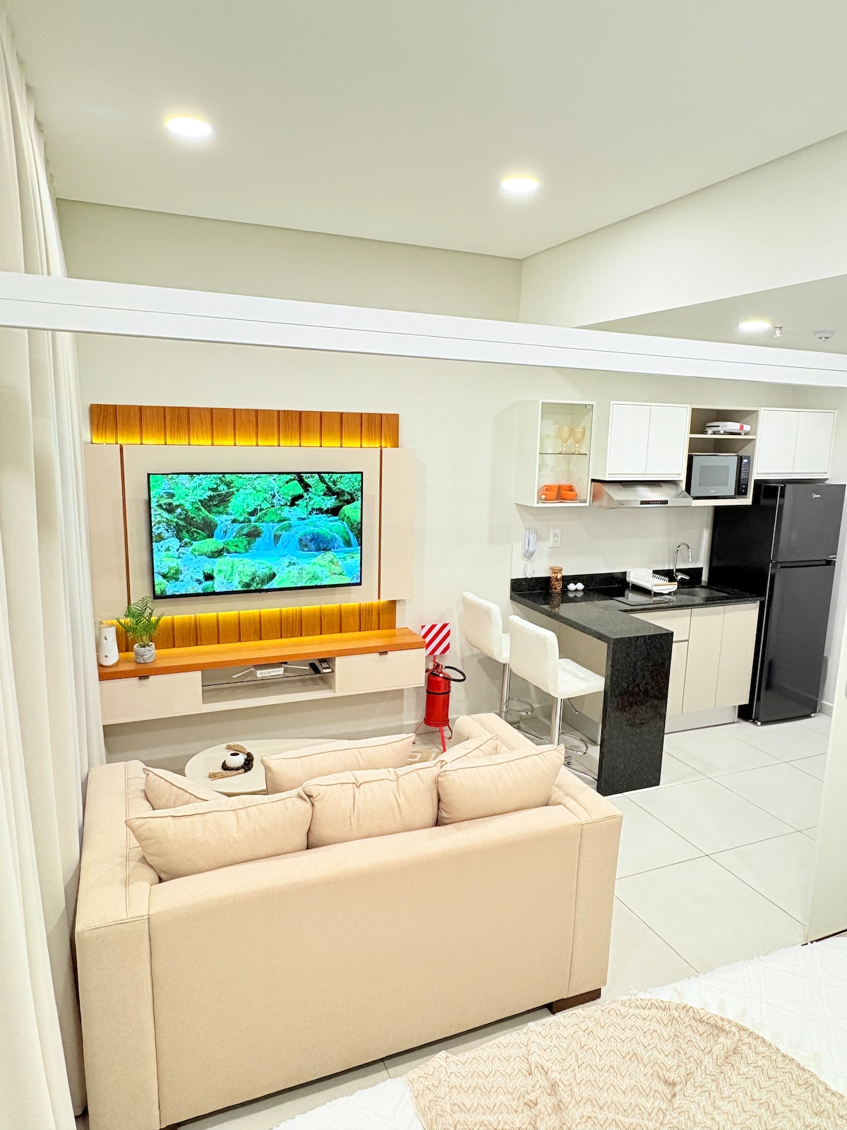 Bienvenue pour une expérience unique au meilleur point de la ville. 🛏️ Chambre : lit de haute qualité, éclairage confortable et design moderne. 🛋️ Salon : Canapé confortable, Smart TV avec accès aux plateformes de streaming et aux grandes fenêtres qui remplissent l'espace de lumière naturelle. 🍽️ Cuisine entièrement équipée pour cuisiner comme à la maison. 🛁 Salle de bain complète : Douche avec eau chaude, serviettes douces et articles de toilette essentiels.
