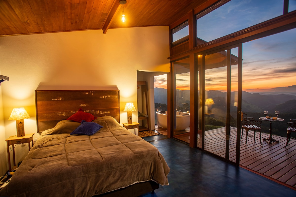 Découvrez le charme de la Serra da Mantiqueira dans cette cabane conçue pour contempler le lever du soleil sans sortir du lit. Venez vous détendre dans notre spa chauffé, observer les étoiles sur le réseau aérien et oscillant. La cabane dispose d'une chambre intégrée avec un lit Queen Size confortable. Dans le salon/la cuisine, un futon super confortable peut accueillir deux autres voyageurs, ce qui rend l'expérience idéale pour les familles. La propriété dispose également de sentiers et de petites cascades.