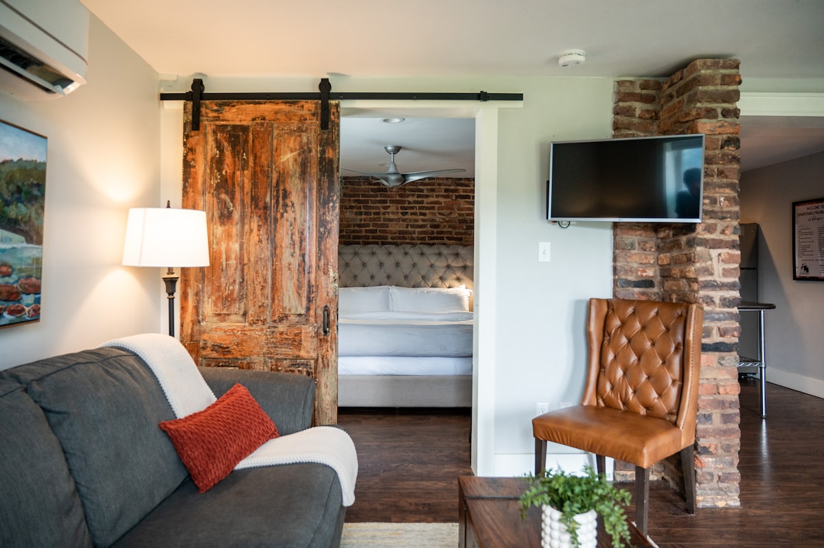This downtown Lynchburg warehouse used to be the Craddock Terry’s main office. This loft has the original vault in it (locked for your safety)! We kept the lofts as open as possible to maintain the integrity of the building, so there is a bedroom area but it doesn’t have wall/a door. There is a courtyard which this unit opens up to (but is not yet accessible to guests as it’s not quite ready yet!) No-smoking unit / building #mainofficelofts #vaultloft
