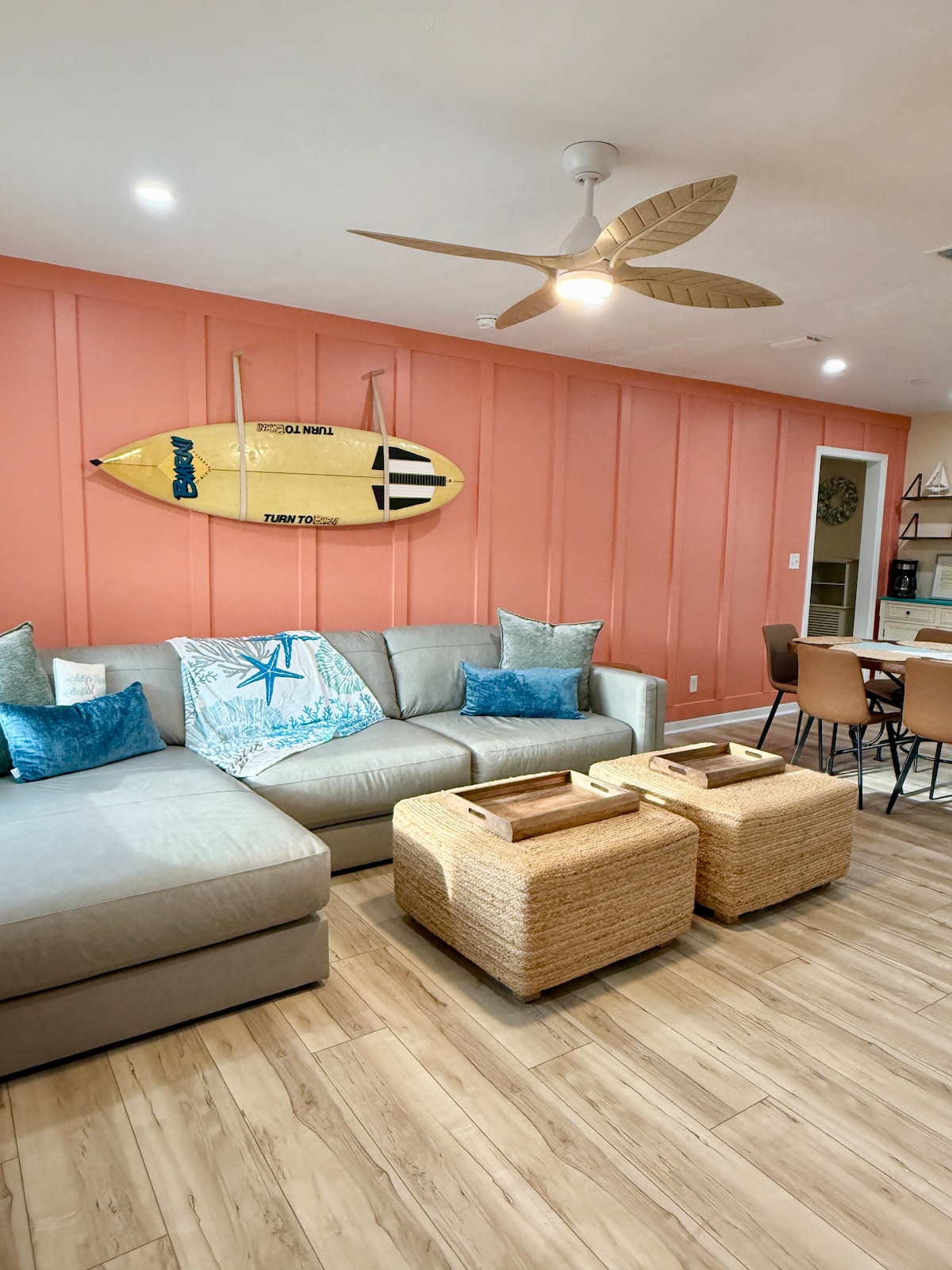 Heated Pool- Coastal Blue Bliss / The Swell! Inquire if you want to rent this duplex but want to make it a private experience! This beautiful upstairs duplex features an open-concept layout made for gathering and easy-living. The outside features a heated pool, green space, plenty of parking and a fire pit. Best of all, you’re just 2 miles from downtown Amelia Island and right across the street from the beach—your perfect getaway awaits!🏝️