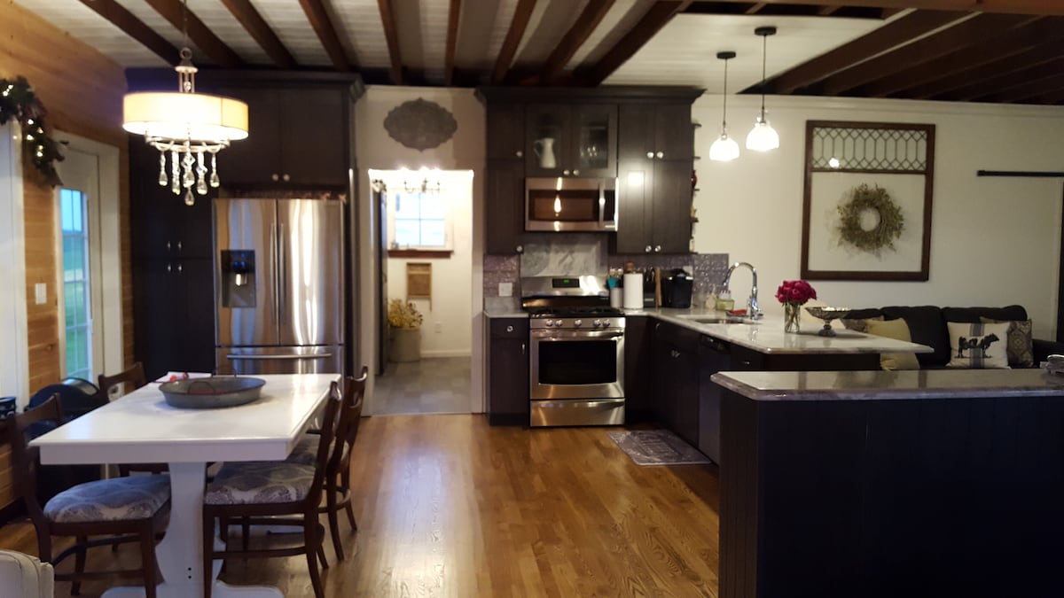 Des rocking chairs de la véranda à la cuisine campagnarde, vous ressentez l'ambiance chaleureuse de cette ferme de 1910. Situé au cœur de Branson, à proximité du Landing, des spectacles et des lacs. Accès facile à l'autoroute 65, à l'autoroute 76 et aux routes secondaires. Nous avons des matelas et une literie queen de luxe. Cuisine de campagne complète comprenant cafetière/Keurig, micro-ondes et lave-linge/sèche-linge. Salle de bain complète avec shampoing, savons et sèche-cheveux. WiFi, télévision intelligente Vizio, DVD et ports USB. Barbecue à gaz extérieur, foyer et jeux.