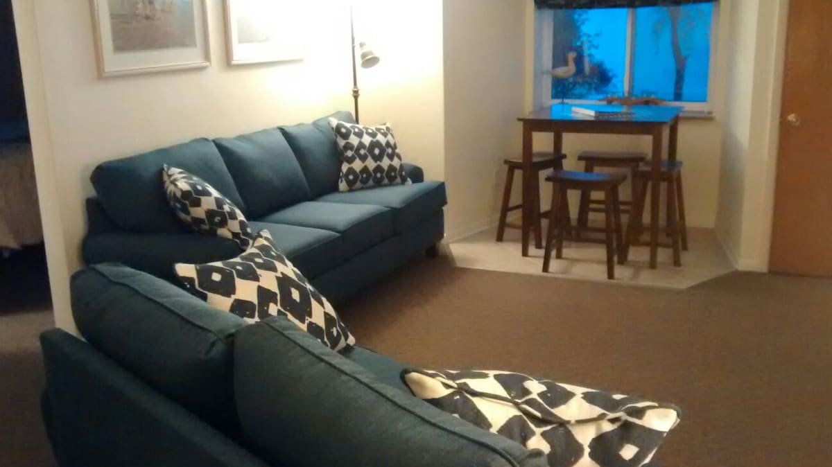 Appartement de 2 chambres au deuxième étage, parking sur place pour deux véhicules (taille passager). Aucune place de garage n'est disponible. Animaux de compagnie interdits et non-fumeur. Deux lits Queen Size. Télévision connectée, mais pas de câble (les voyageurs utilisent leurs propres mots de passe). L'accès par la porte avant dispose d'un éclairage de soirée avec une boîte à clé sécurisée pour l'enregistrement automatique. Lave-linge/sèche-linge disponibles hors site (fonctionnant avec des pièces de monnaie, situés dans l'immeuble d'appartements adjacent - clé d'accès fournie). Bruit occasionnel et limité du train à 1/4 de mile et plus. Notre bureau est au 1er étage.